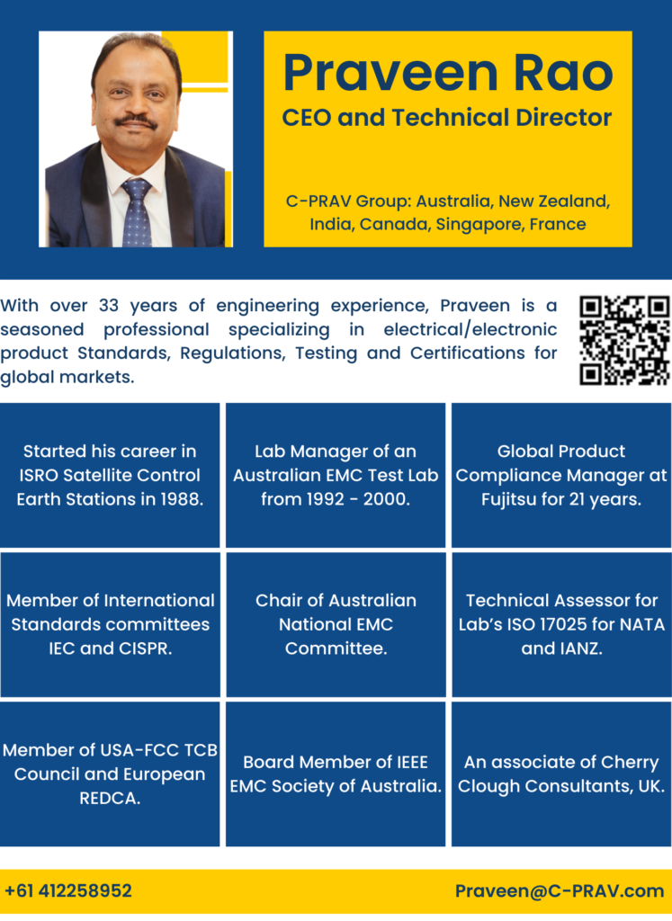 C-PRAV is under the leadership of Praveen Rao, a seasoned professional with over 33 years of engineering experience, specializing in electrical product Standards, Regulations, Testing & Certifications for global markets. Alongside a team with decades of expertise and a passion for precision, the C-PRAV Group stands for integrity, technical excellence, and a commitment to helping our partners achieve global market access with confidence.