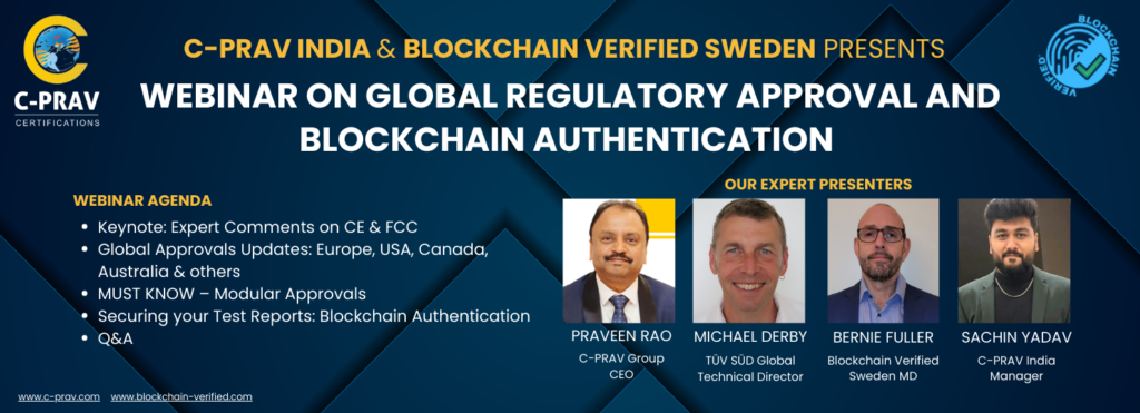 We are pleased to share the successful completion of our recent webinar on “Global Regulatory Approvals and Blockchain Authentication” on the 12th February 2026. This event was organized by C-PRAV Certifications in collaboration with Blockchain Verified Sweden — a first-of-its-kind initiative in India. Watch our Key Highlights montage video to get a snapshot of our webinar below, featuring Praveen Rao (CEO & Technical Director, C-PRAV Group), Michael Derby (Global Technical Director, TUV SUD), Bernie Fuller (Managing Director, Blockchain Verified Sweden AB) and Sachin k Yadav (India Manager, C-PRAV India).