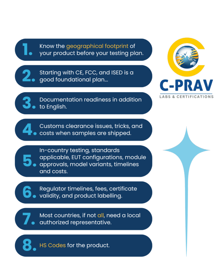 C-PRAV Certification Services has strategically located offices and an extensive network of reliable partners across the globe with whom we work closely to complete the approvals in those specific countries. We are committed to delivering seamless Global Market Access services leveraging our extensive industry experience, global network of accredited testing partners, and in-depth knowledge of international regulatory landscapes to offer our clients: